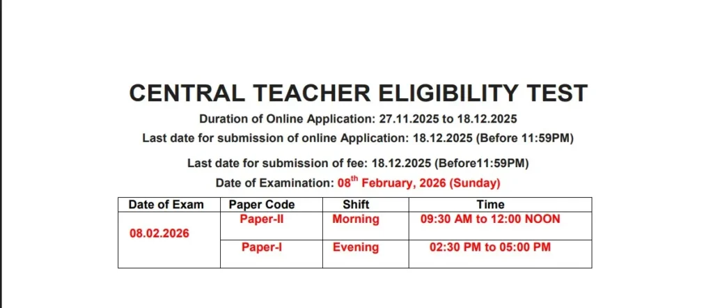 सीटीईसी 2026 की परीक्षा का ऑफलाइन तरीके से 08 फरवरी 2026 को दो शिफ्ट में जिसमे पहली शिफ्ट 9:30 AM – 12:00 PM तक और दूसरी शिफ्ट 2:30 PM – 5:00 PM आयोजित की जाएगी